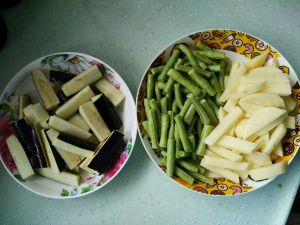 茄子,土豆去皮切成滚刀块,放清水中浸泡几分钟,菜椒去蒂去籽切片