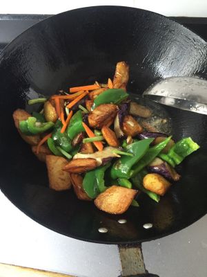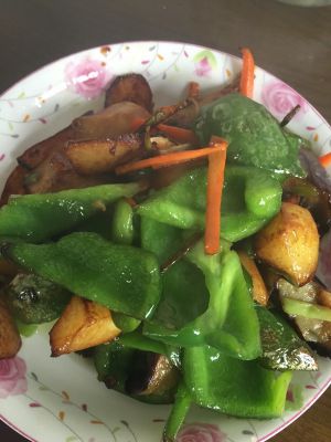 留底油,放蒜姜葱,然后再把炸好的土豆、茄子,放入青椒翻炒。最后调味出锅