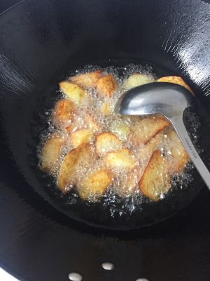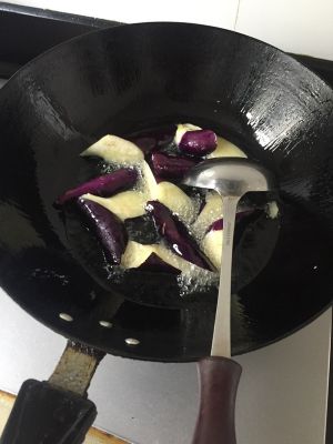 锅中热油,油量以没过茄子,和土豆为准,待油热,放入土豆,炸至金黄捞出。