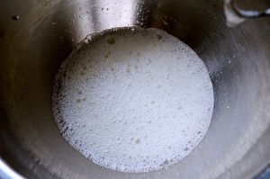 继续打发,打发到大气泡消失,变成小气泡,再放入三分之一砂糖。