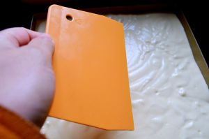 用刮板将蛋糕糊刮平整,刮的时候不要用力,自然力度帖住表面即可