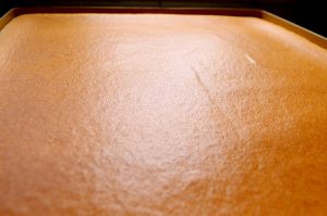 将混合好的面糊,倒入28×28的烤盘中,用刮刀刮平整,注意手力要轻柔哦!轻轻贴着面糊刮就行。