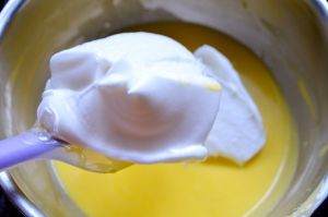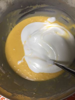 取1/3蛋白霜加入蛋黄糊中。