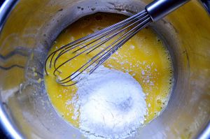 在放有蛋黄的容器中加入牛奶,玉米油,然后混合均匀。