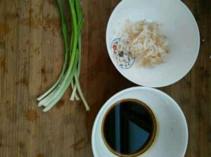 虾皮用开水烫过沥干水分,碗里放适量盐,味极鲜酱油,花椒油,香油搅匀做成调料汁,香葱备好