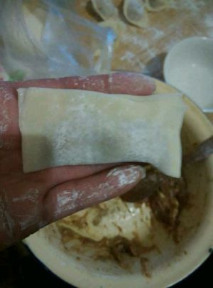 切成梯形,嫌麻烦就用买的馄饨皮,不过还是感脚自己做的皮更有面的香气。