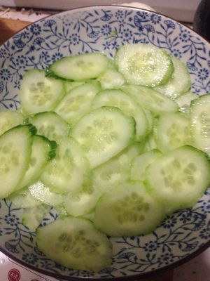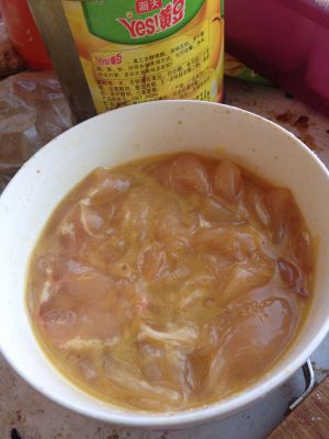 肉片加料酒芡粉较上劲备用。黄瓜切片