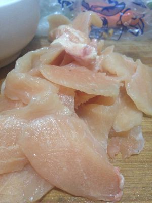 鸡胸肉半化的时候切片。瞧瞧这薄的。哈哈。