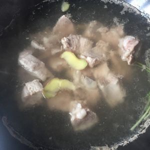 排骨洗净,冷水放入葱姜和适量料酒大火煮开