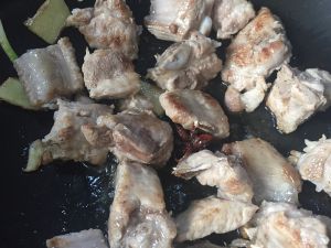 排骨煎至两面焦黄,放入料酒,(料酒炒至一会,让料酒味道挥发),接着放入生抽,老抽适量,上色