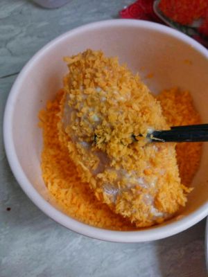 煮到八成熟的鸡翅捞出趁热撒上炸鸡粉,让每个鸡翅都粘上炸鸡粉。