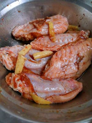 起锅烧油,油温热了后放入鸡翅,小火慢慢炸至金黄色即可,出锅后放在网筛上滤滤油