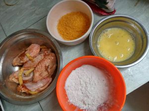 准备一碗面粉,一碗清水。 将鸡腿包裹面粉之后,放入清水中,轻轻拿起,抖动一下水份后,继续蘸取面粉。 以此处理剩下的食材