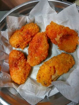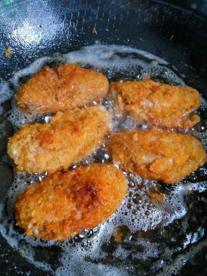 锅里先热油,鸡翅裸上面粉蛋液最后是面包糠,