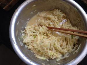 土豆打成丝,打入两个鸡蛋,一棵大葱或两棵香葱,加很少面粉,放入两小勺盐、味精,搅拌均匀