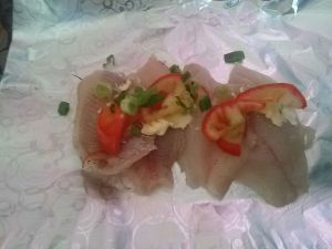 将生鱼片排在锡纸上,在各片抹上黄油