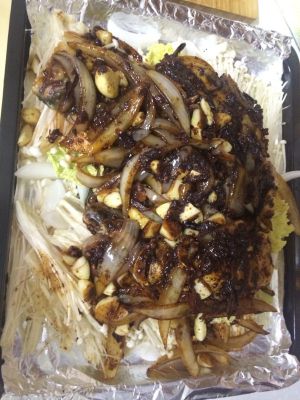 放料酒,孜然粉,生抽,十三香,盐,鸡精腌半小时(鱼太大了烤盘放不下只有把鱼头切开了)