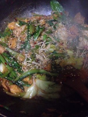 依次将难熟的菜放入锅内(白菜芹菜先放),加少许生抽,白糖