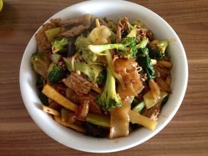 然后倒入木耳和笋尖,继续煸炒,此时如果木耳会崩,可以少加点水,或倒入海鲜酱油,然后依次放入其他材料一起翻炒:西蓝花(入锅前最好热水焯熟),生菜,以及土豆,虾等。。。待所有材料都炒熟了,可加蚝油了,如果觉得咸味还不够,可少加点盐