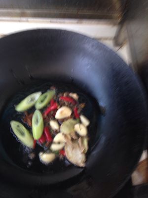 油放的比平时炒菜多一点,放葱姜蒜爆香。再放郫县豆瓣酱和花椒
