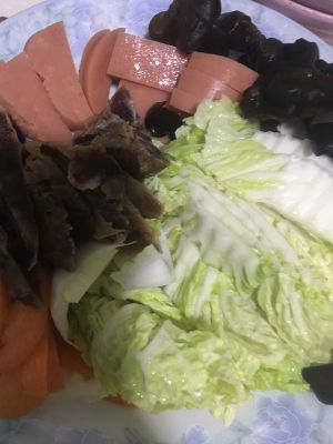 将木耳,青菜,香菇,蘑菇,鱼丸等放入沸水中焯一下,不要煮软,稍微煮熟。