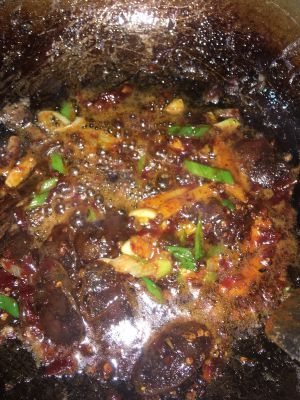 油量看你菜量,菜多就多放点,(红灯笼辣椒)干辣椒炝锅,放郫县豆瓣酱,先炒酱,没拍图,直接说步骤了,觉得有点粘锅可以加一点点水,然后放麻椒和花椒,八角,依次倒入香菇,腌制好的牛肉和鸡翅,用辣酱炒变色