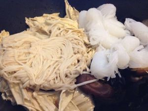 香菇,木耳,金针菇,魔芋丝,腐竹,焯水,控干水分备用