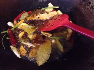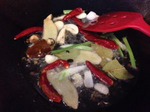 锅中多油,下葱姜蒜和其他调料炒出香味