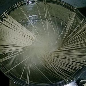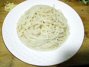 水开放100克面条,煮熟,但注意不能太过了,要不然不筋道,过凉水捞出。