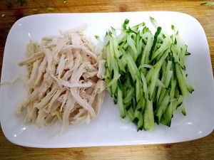 将黄瓜洗干净切丝,鸡肉撕成细丝,