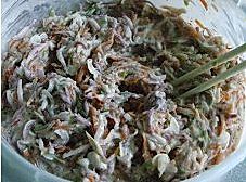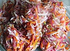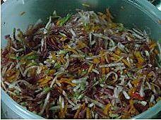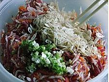 白萝卜切丝,越细越好,放少量盐,腌制出多余的水,萝卜就没那么辛辣了