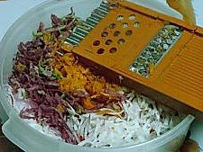 白萝卜,胡萝卜搽丝,可以放虾皮或猪肉馅,把辅料一起拌匀。面粉里放些盐和色拉油用温水和面,饧20分。