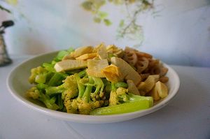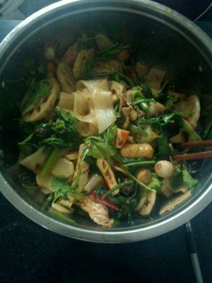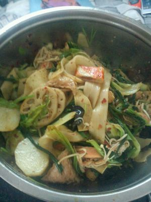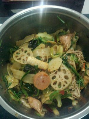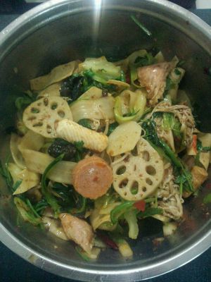 倒入炸好的莲藕,花菜,笋,腐竹,莴笋。。。。 翻炒匀