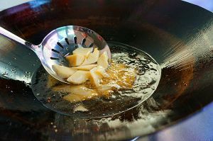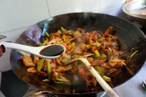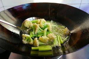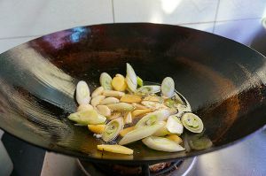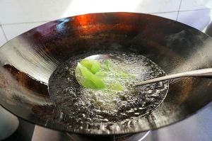 4将过了凉水的菜倒入锅中翻炒,放一点鸡精。