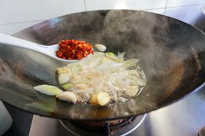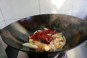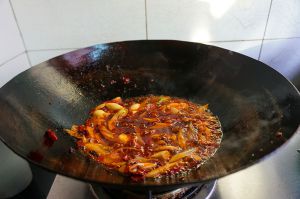 3热油,将花椒,麻椒,葱姜蒜,红辣椒依次放入油锅里,爆炒后将碗里的调料倒入锅中翻炒。