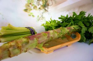 1将菜洗干净,用开水煮一下,煮到八成熟。用凉水过一下,备用。
