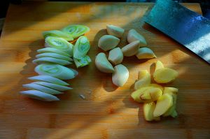 大葱切斜刀块儿,大蒜去皮,生姜切块