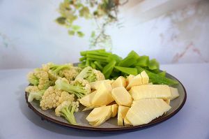 其实做这个的食材都木有绝对的,自己喜欢的就行,但是前提是特别爱出水的还是不要;一根笋,小节藕,和花菜 记住每样都不需要太多,所以买的时候注意下,不然一道菜下来剩菜好多啊