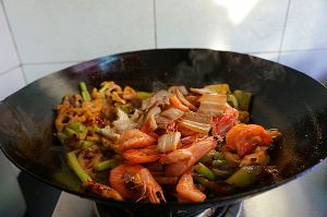 放入焯过水的蔬菜一起入锅大火翻炒四-五分钟