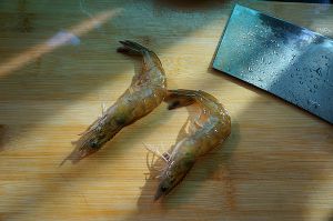 接着倒入五花肉,虾,,加入少许盐,鸡粉,一点点的糖调味儿