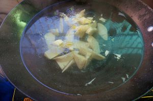 把各种丸在热水里解冻煮熟,土豆片,藕片,金针菇,宽粉,香菇等一切需要事先煮熟的东西焯水备用
