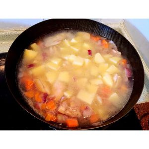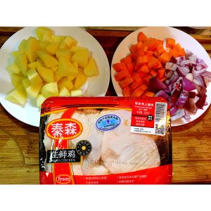 把土豆、洋葱、胡萝卜切小块,鸡肉切大块(我用的是脱骨鸡腿肉,也可以用整鸡或者鸡翅,甚至猪排骨)