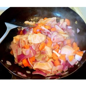 一次放入胡萝卜.土豆.洋葱.鸡肉.翻炒几分钟后.加入4/3的开水。在放咖喱块.收汁。