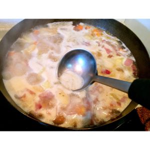 视菜多少放入咖喱。我是一个土豆一个红萝卜一碗鸡腿菇,放了三分之二盒咖喱。然后兑入一碗热水。一碗热牛奶。不想专门热牛奶的话可以半碗牛奶半碗热水掺起来兑进去比较省时间。