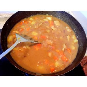 火不能太大,保持小小的沸腾,并不时搅拌以防粘锅,咖喱块是调好味的不需要加其他调味料,但是大家可以按自己的口味适当添加盐和胡椒