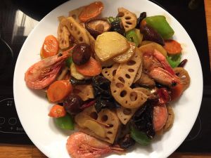 四五分钟后放入香菇木耳,大虾,继续翻炒,加入少许五香粉,没有就加花椒也行,少许酱油上色增香,翻炒均匀