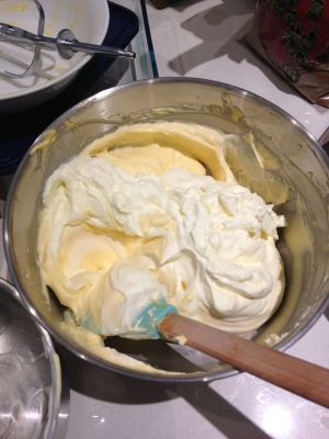 将打发好的thickened cream加入先前的蛋黄cheese混合糊再加适量double cream用刮棒搅拌均匀(个人在这里会加咖啡和marsala wine一点点提味)