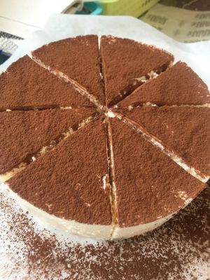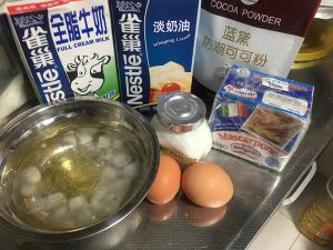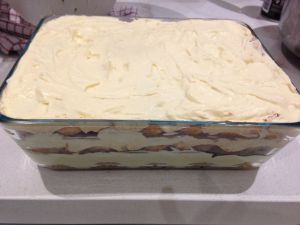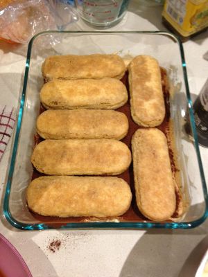 espresso咖啡泡开加marsala wine,手指海绵饼干快速浸泡咖啡然后铺在容器底,盖上搅拌好的蛋黄cheese奶油糊,撒一层可可粉