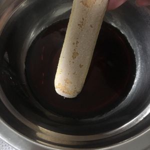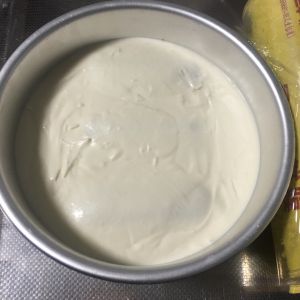 手指饼干放入模中,并刷上咖啡液,放在一边待用,这是用的七寸的模具