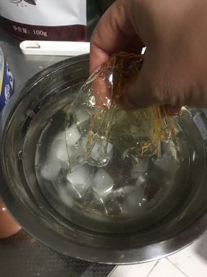 将吉利丁片冰水泡软,放入热牛奶中,溶解后与步骤3搅拌均匀